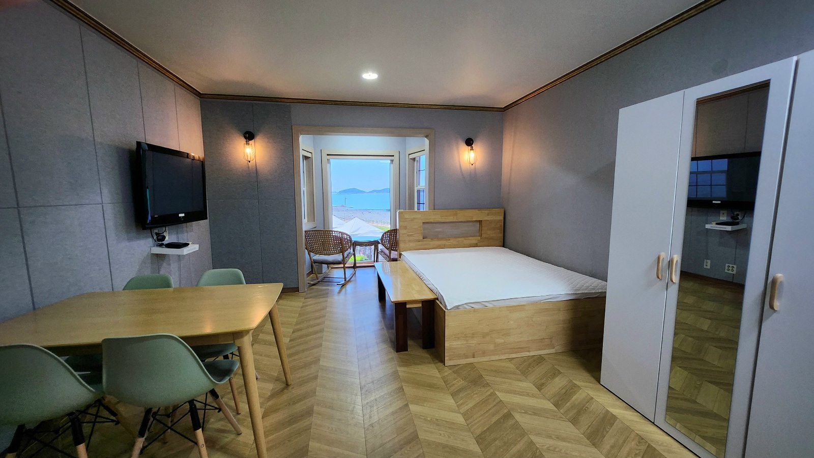 객실시설 : 더블사이즈 침대1, 더블사이즈 침구류1, 에어컨1, 냉장고1, 실외화2