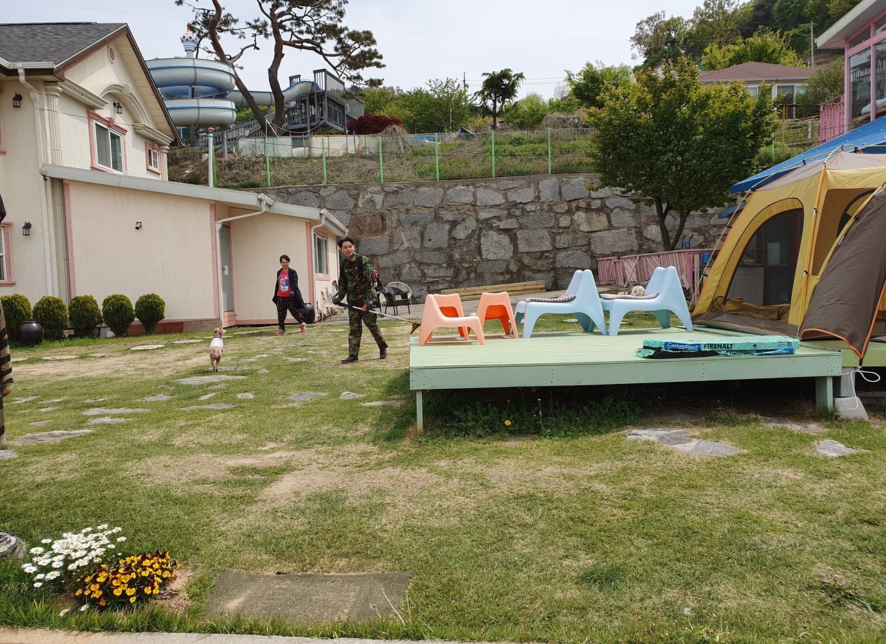 애견들이 신나게 뛰어놀 수 있는 인조잔디밭입니다. 야외 바베큐장과 맞닿아 있어 애견들은 잔디밭을 즐기고, 사람들은 바베큐를 즐기실 수 있습니다.